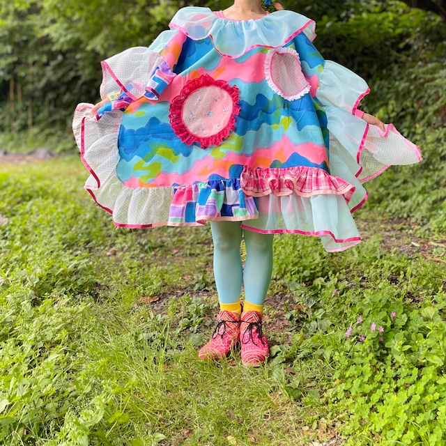 どちらを前にしても着ていただける一石二鳥ラッキーひゃっほいなワンピースです♡ A面は蛍光ピンクのメッシュ生地にワッペンをつけた身頃です♡ ワッペンは縫い付けにしています♡ 走り縄跳びを犬と一緒にしている運動神経の良さそうなワッペンに惹かれてほしいです♡ B面はお花の装飾があるチュール素材にレースなどを飾りました 反復横跳びができそうな2本のラインをイメージして♡ サイズ 腰幅 平置き約74cm 丈(長いところ) 平置き約120cm モデル身長145cm