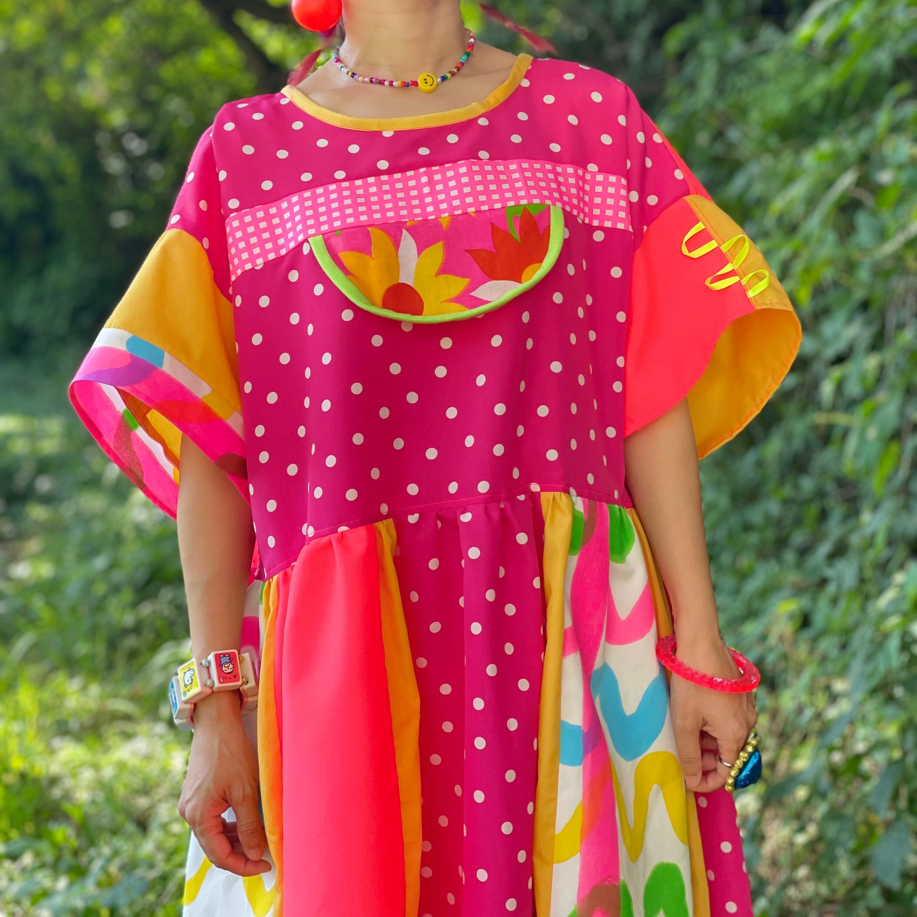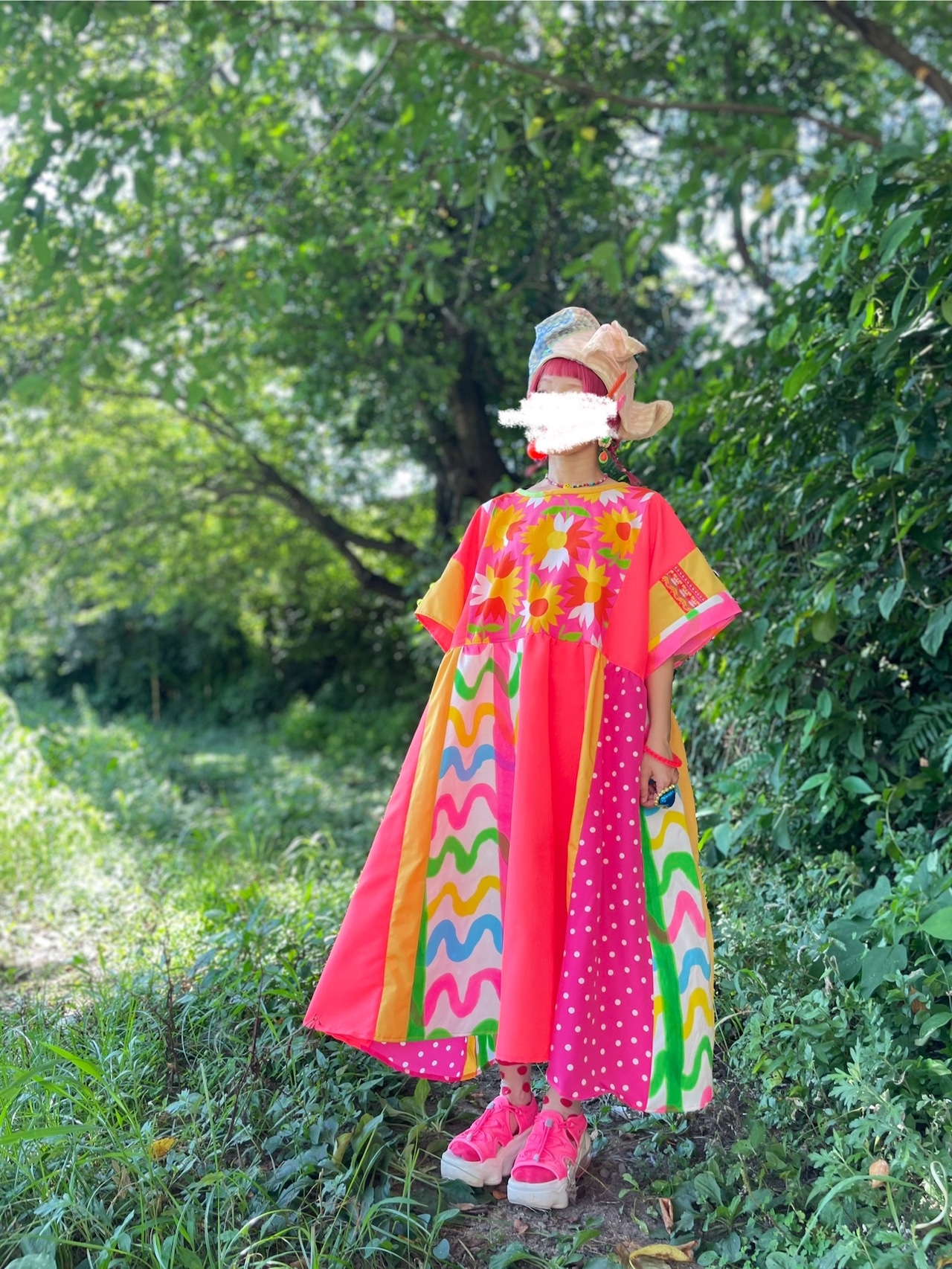ヴィンテージの生地やハンドメイドのペイント生地(仕入れたもの)を使用した個性的なワンピースです。